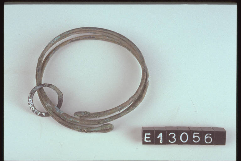 Orecchino in doppio filo di bronzo avvolto a spirale sul quale è infilato un anello