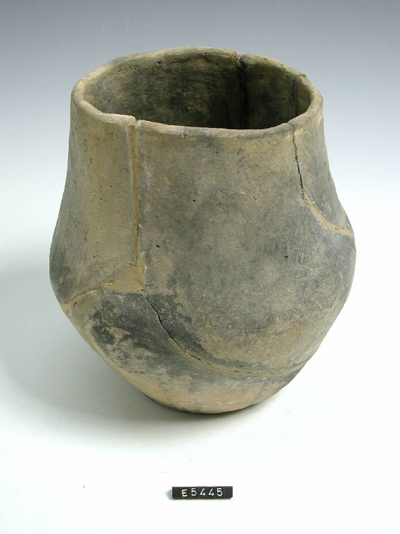 Orlo appiattito, corpo biconico tendente all'ovoidale, fondo piano.