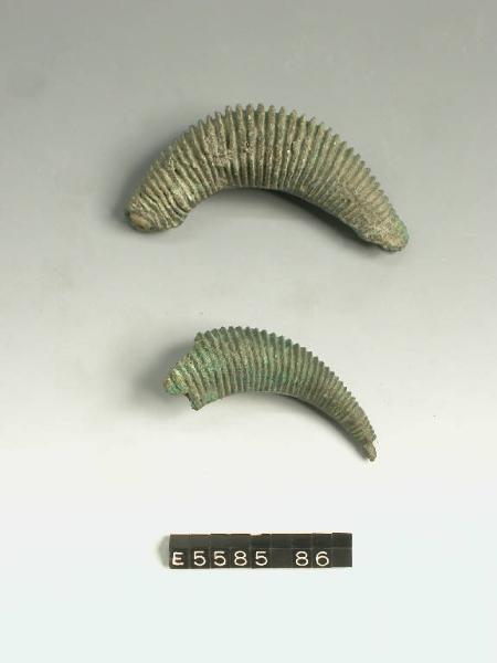 Fibula a sanguisuga con arco di grandi dimensioni e forte spessore, con anima in cotto. Arco decorato da una serie di fitte coste sottili a spigolo vivo.