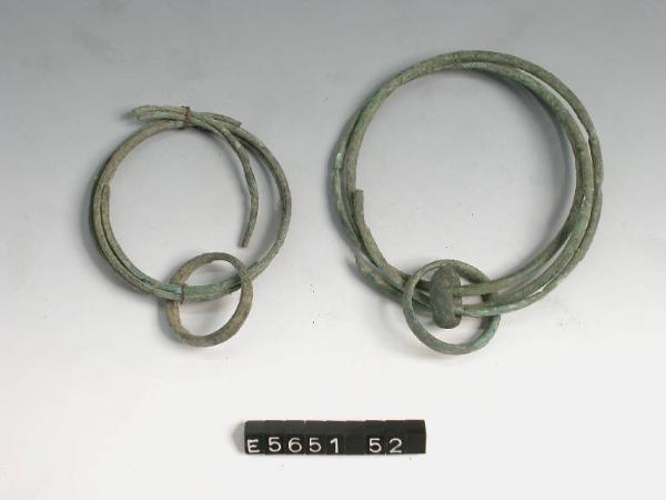 Orecchino in doppio filo di bronzo avvolto a spirale sul quale è infilato un anello