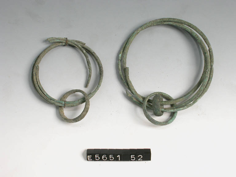 Orecchino in doppio filo di bronzo avvolto a spirale, con due anelli