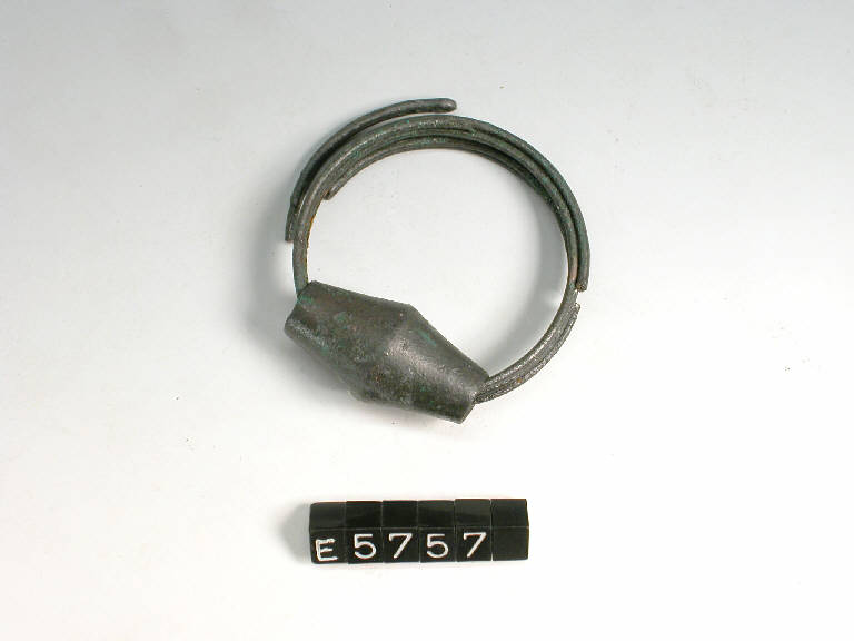 Orecchino in doppio filo di bronzo avvolto a spirale con perla biconica