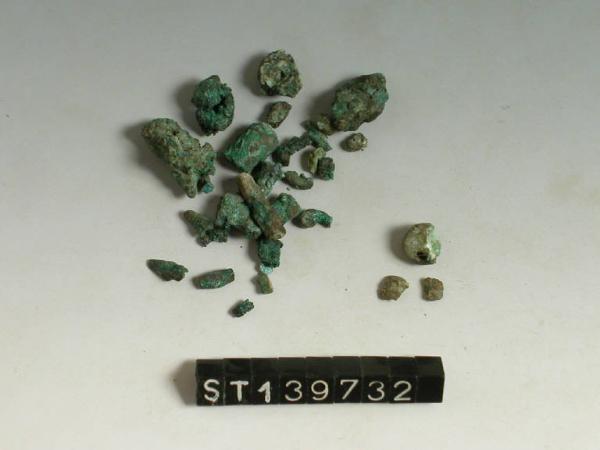 Frammenti di doppio filo di bronzo; verghetta a sezione circolare; scorie di bronzo e perline di forma biconica.