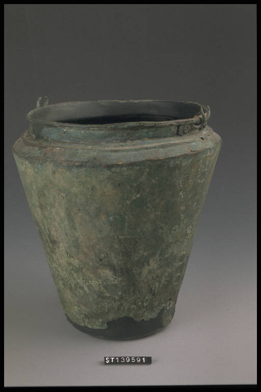 Situla in lamina bronzea; collo distinto; spalla cordonata; ansa con attacchi ad occhiello.