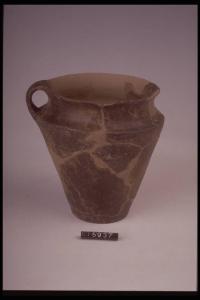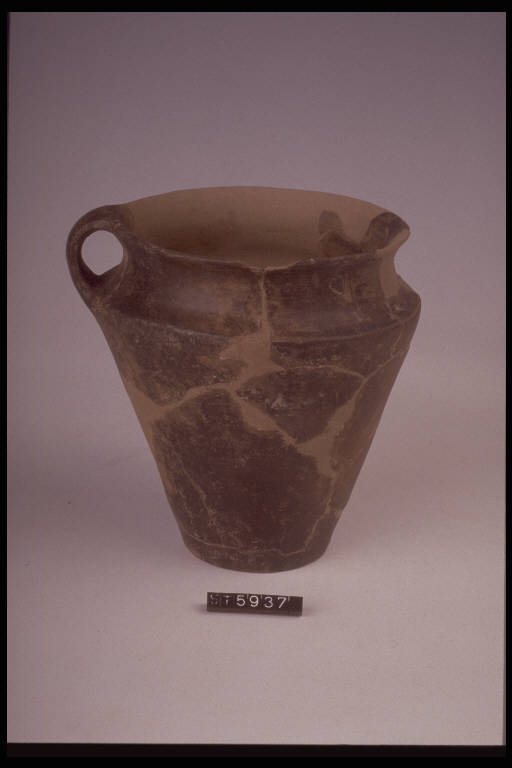 Boccale a corpo troncoconico di profilo rettilineo con ansa a nastro verticale impostata fra orlo e parte alta del corpo, labbro estroflesso, fondo piano.