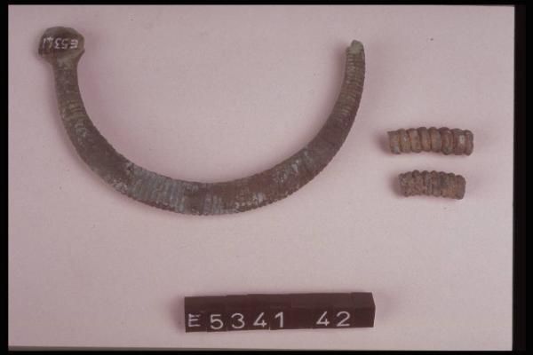 Tre elementi di collana in verghetta a sezione triangolare avvolti a fitta spirale.