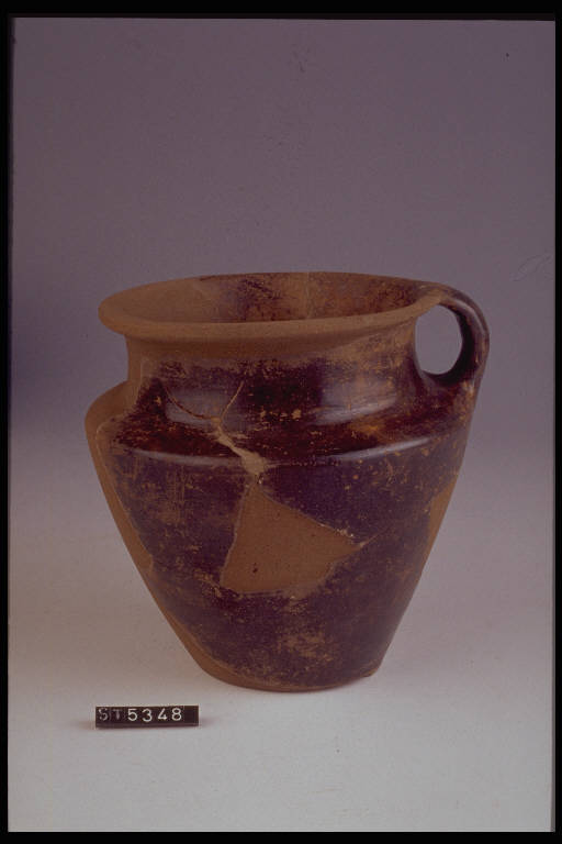 Boccale situliforme con ansa a nastro impostata fra orlo e spalla.