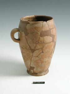 Boccale situliforme con ansa di sezione pianoconvessa, orlo arrotondato, basso piede troncoconico. Decorato lungo l'orlo e il piede da una fascia nera grafitifera.