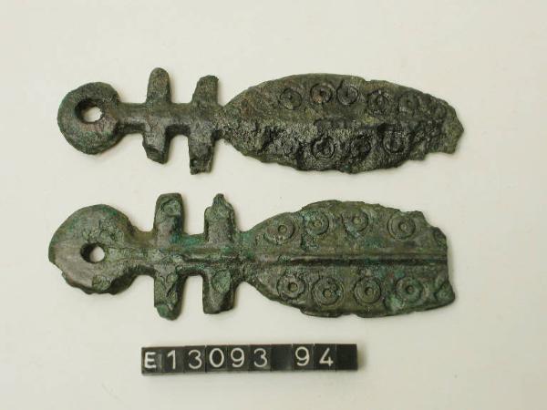 Pendaglio a spatola decorato ad incisione da cerchietti con punto centrale. L'elemento che unisce la spirale all'anello di sospensione è attraversato da due sbarrette ad esso perpendicolari.