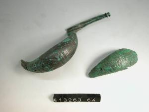 Fibula a navicella con arco decorato da incisioni lineari e lunga staffa desinente ad appendice piano-convessa