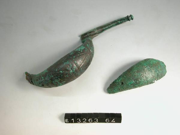 Fibula a navicella con arco decorato da motivi lineari incisi