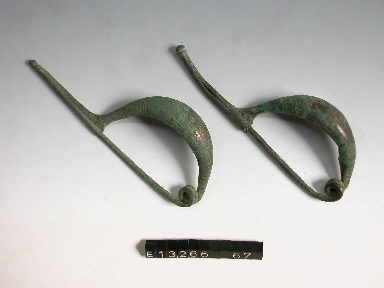 Fibula a navicella con arco decorato da motivi lineari incisi e lunga staffa con estremità profilata
