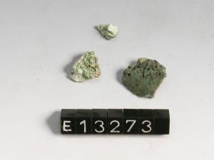 Frammento di corallo bianco con patina verde per il contatto con un oggetto di bronzo