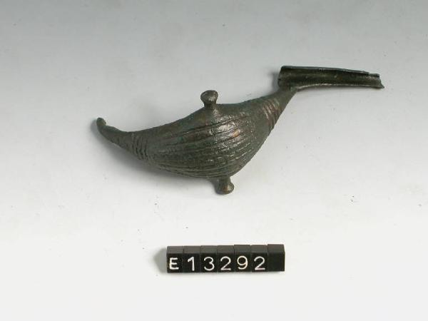 Fibula a navicella romboidale con bottoni laterali e arco decorato da linee parallele incise