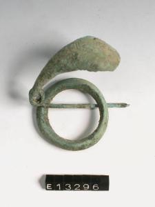 Fibula a navicella con arco decorato da motivi lineari incisi; un anello è infilato sull'ago