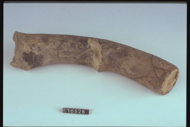 Frammento di braccio di doppiere decorato a impressione da cerchielli, cerchielli concentrici, S rovesciate e figure antropomorfe