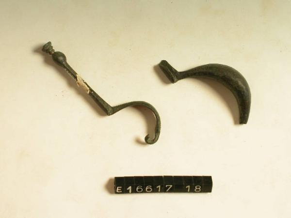 Fibuletta ad arco pieno, di sezione piano-convessa, arco decorato da fasci di linee parallele alle estremità; lunga staffa desinente a globetto e appendice troncoconica cava