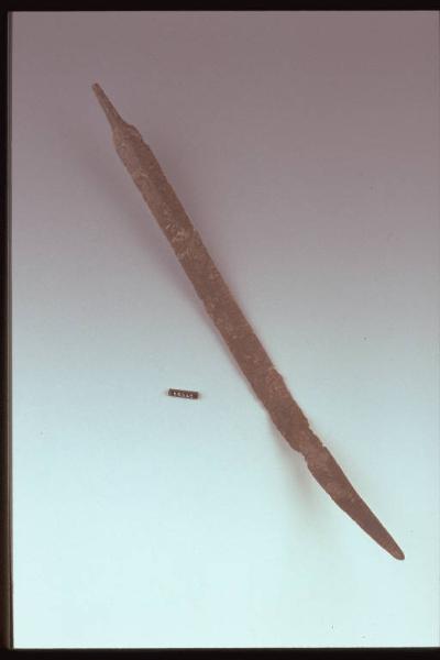 Spada a lama lunga e stretta, breve codolo piatto. Conserva piccoli frammenti del fodero.