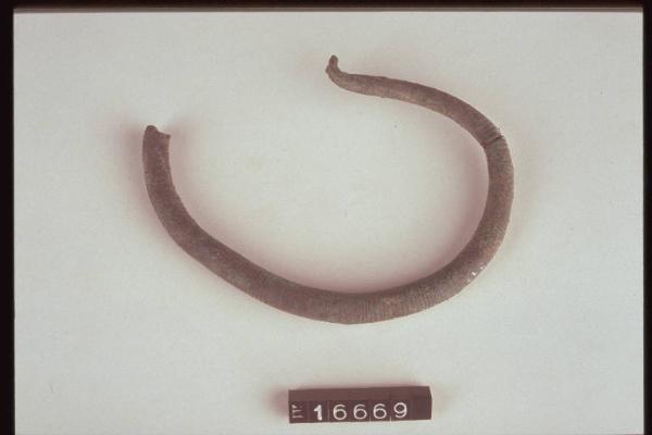Torquis di verghetta a sezione circolare decorata da fasci di linee con capi arrotolati