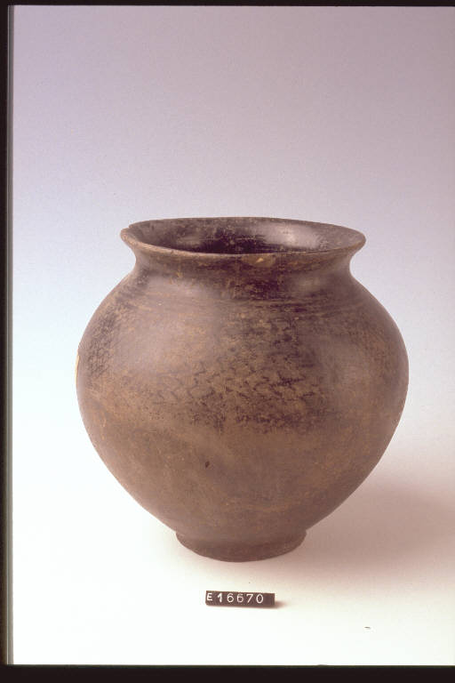 Urna ovoide, spalla alta, decorata sulla spalla da riquadri metopali riempiti a reticolo da linee a zigzag