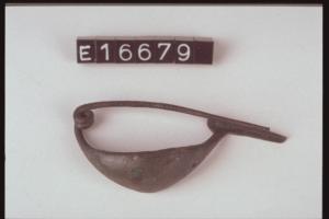 Fibuletta a navicella decorata da linee parallele incise. Lunga staffa con estremità assottigliata