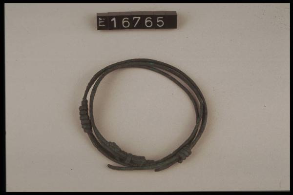 Orecchino in doppio filo di bronzo avvolto a spirale, con tre saltaleoni avvolti sul filo