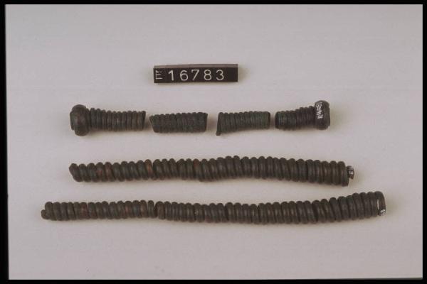Sei frammenti di saltaleone, ottenuti con verghette diverse, infilati su un filo. Due di essi presentano ad una estremità un anellino di nastro di sezione piano-convessa.