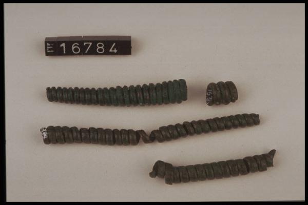 Tre frammenti di saltaleone, ottenuti con verghette diverse; uno di essi presenta profilo conico; su uno è infilato un frammento di saltaleone di diametro maggiore, attualmente saldato.