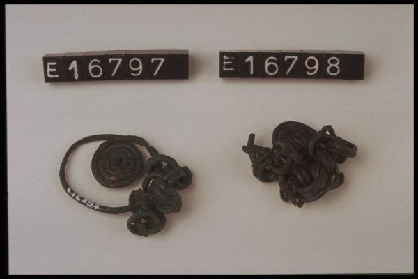Frammento di pendaglio a doppia spirale saldato a un frammento di catenella
