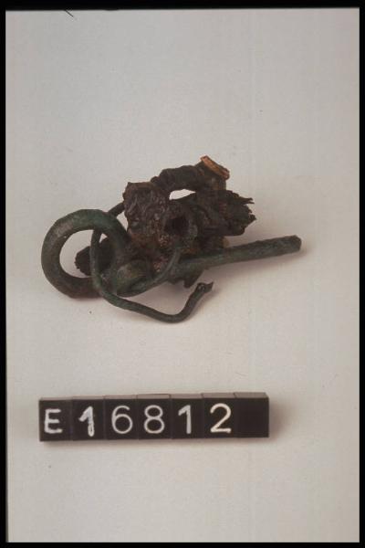 Ammasso di oggetti saldati tra loro: filo di bronzo, anellino, spillone con testa a rotolo, anellini di filo di bronzo, frammenti di verghette di ferro