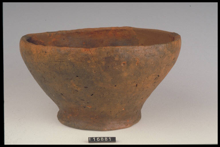 Ciotola a corpo troncoconico, orlo leggermente rientrante, basso piede obliquo.