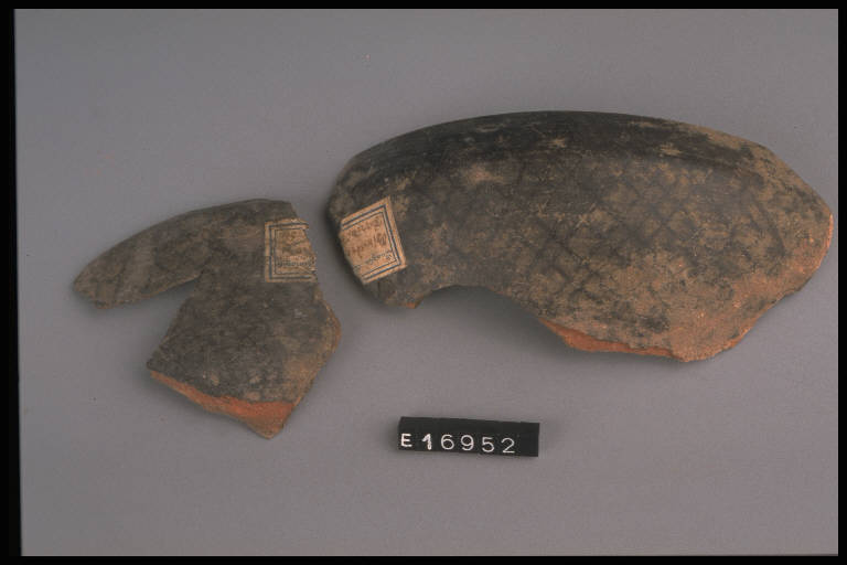 Coppa a corpo troncoconico, orlo leggermente rientrante. Decorazione a stralucido nero con motivo a reticolo sul corpo e a fascia sull'orlo.