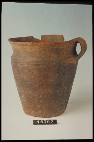 Boccale situliforme decorato a incisione sotto la spalla da tre linee parallele e da zigzag a tre tratti.