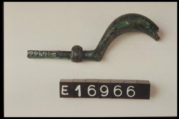 Fibuletta a sanguisuga con corpo pieno, decorato alle estremità da fasci di linee parallele e lunga staffa con anello ferma-ago