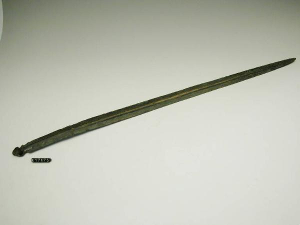 Spada con restringimento prima del codolo; codolo a profilo subquadrangolare; conserva un ribattino