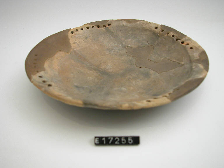 Piatto con labbro appena distinto, provvisto di file di fori in prossimità dell'orlo