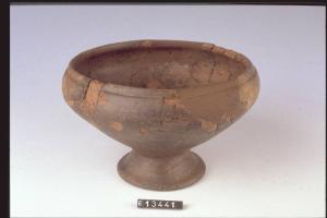 Ciotola a corpo troncoconico con orlo a cordoncino e piede troncoconico.