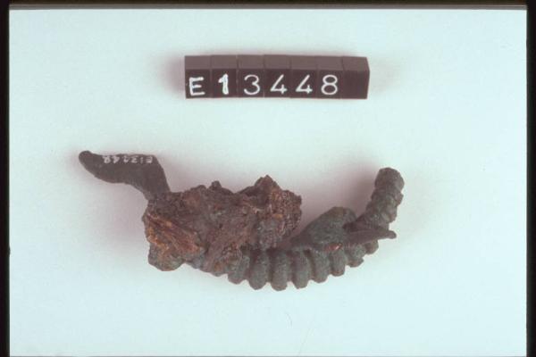 Fibula a grandi coste con staffa asimmetrica e decorazioni lineari sopra la molla e la staffa. Vi compaiono saldati frammenti di ferro e di bronzo.