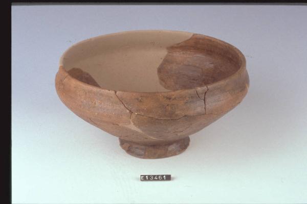 Ciotola a corpo tronconico con basso piede obliquo e orlo rientrante.