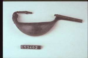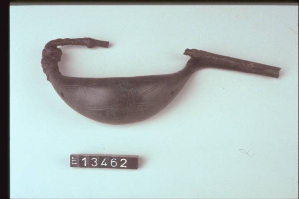 Fibula a navicella con arco decorato da linee incise; molla in bronzo e ago in ferro.