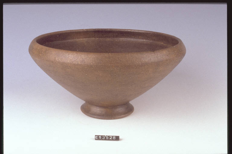 Ciotola a corpo troncoconico, orlo rientrante e basso piede obliquo, con un motivo quadrangolare inciso sul fondo esterno.