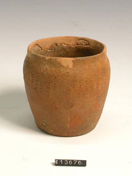 Vasetto a corpo troncoconico con labbro assottigliato, decorato da file verticali di tacche.