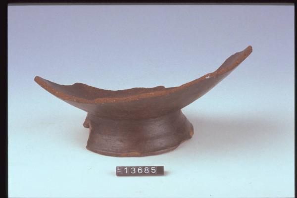 Frammento di recipiente con pareti a profilo convesso e piede troncoconico.
