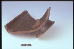 Ciotola a corpo troncoconico con orlo rientrante e basso piede obliquo; una X è incisa sul fondo interno.