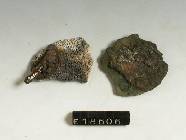 Frammento di lamina di bronzo e frammento di ferro attaccato ad un osso.