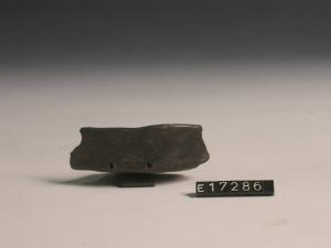 Ciotolina carenata con breve labbro verticale e due fori passanti sulla carena. Presenta tacche parallele incise sulla parete interna. E' in ceramica fine nera lucida.