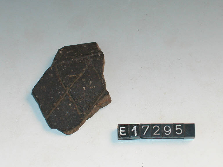 Vaso a bocca quadrata decorato da linee incise a reticolo.