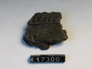 Frammento di parete di recipiente decorato da filo di tacche impresse, comprese tra due linee parellele incise.