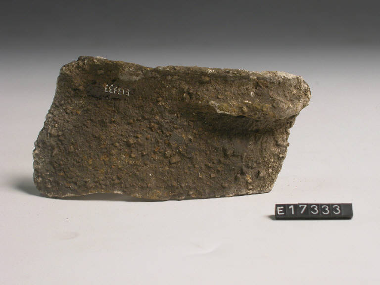 Frammento di olla ovoide con breve labbro svasato, provvista di una piccola presa sull'orlo.