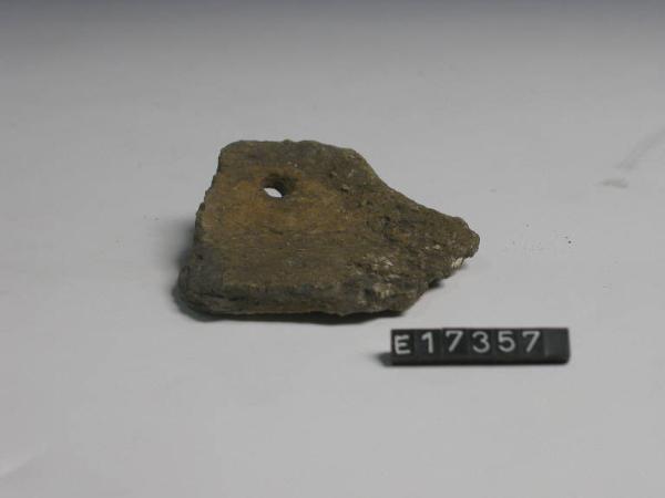 Frammento di fondo piano con attacco di parete provvisto di foro per restauro antico.